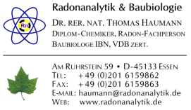 Sachverständigenbüro für Radonanalytik und Baubiologie, Essen Dr. rer. nat. Thomas Haumann Diplom-Chemiker  Radon-Fachperson Baubiologe IBN, VDB zert. Anerkannte Stelle für die Messung von Radon in der Luft an Arbeitsplätzen nach § 155 Abs. 4 StrlSchV Am Ruhrstein 59 D-45133 Essen   Tel:  +49 201 615 9862   Fax: +49 201 615 9863 haumann@radonanalytik.de www.radonanalytik.de Radon und Radioaktivität Radon in der Raumluft Radon in der Bodenluft Radon am Arbeitsplatz Radon Rn50-Test Radon-Quellensuche Untersuchungen Gutachten Bewertung Beratung Fortbildung Vorträge Forschung Mitgliedschaften: Fachverband für Strahlenschutz e.V. Verband Baubiologie e.V. Berufsverband Deutscher Baubiologen, VDB e.V.